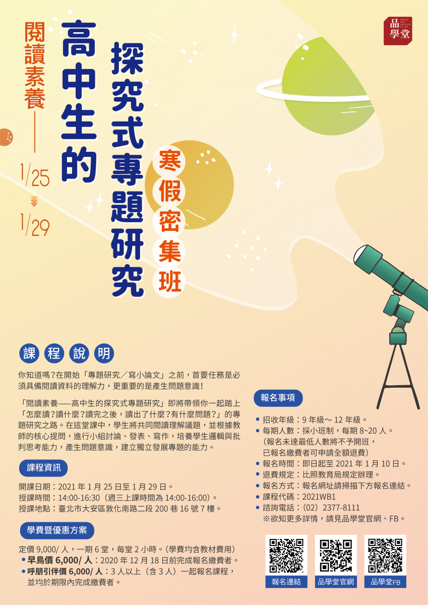 首頁 / 課程資訊 / 2021WB1閱讀素養——高中生的探究式專題研究 寒假密集班